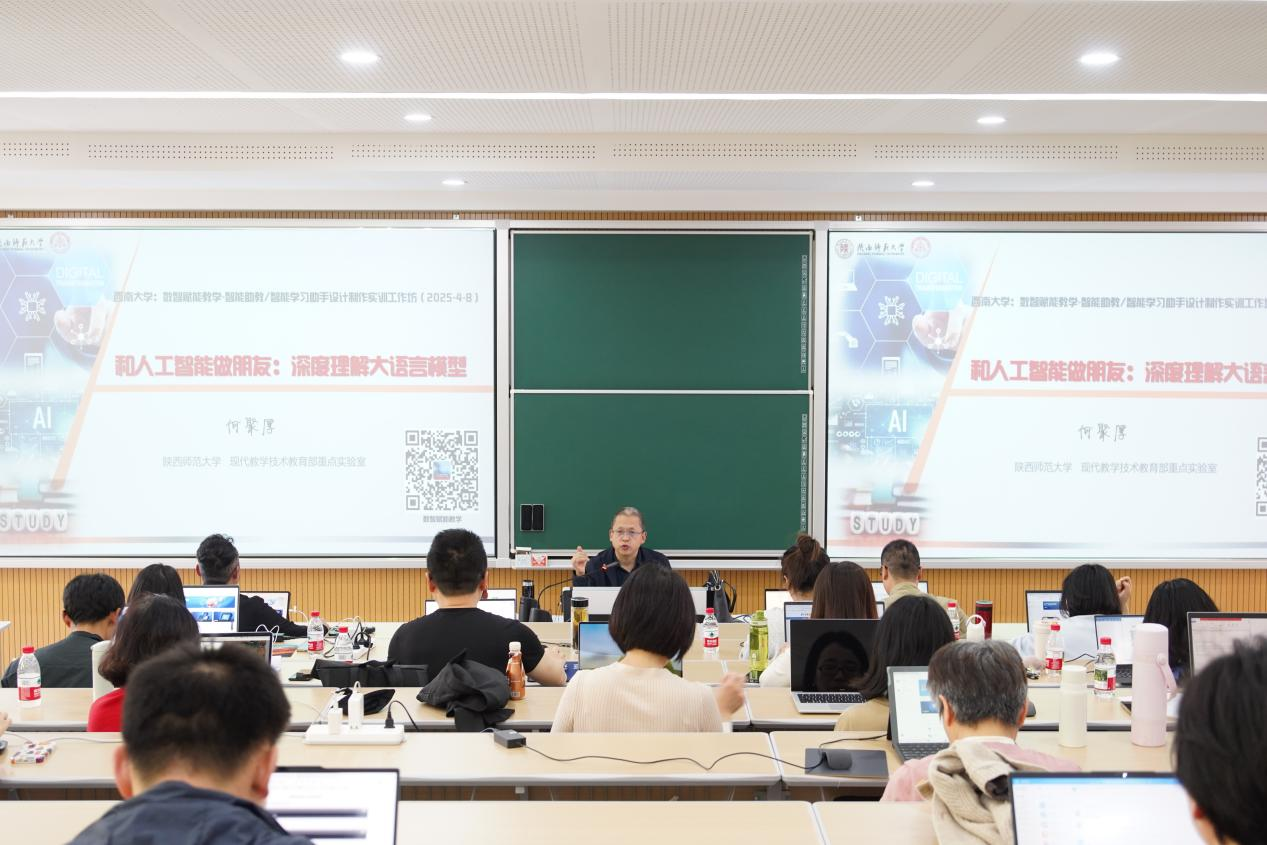 4月8日,何聚厚首先对数智赋能教学的重新设计与实践进行了具体画像,系统性解析智能体在重构教学设计中的核心价值,并结合典型案例阐释数智赋能的底层逻辑与教育教学实践范式。下午的实训环节,何聚厚带领老师们进行了AI角色设定与智能学习助手/智能助教设计制作实训,包括人工智能技术概述、AI角色设定策略与技巧,引导教师完成教学智能体的初级架构搭建,初步掌握AI技术与教学场景的融合方法。