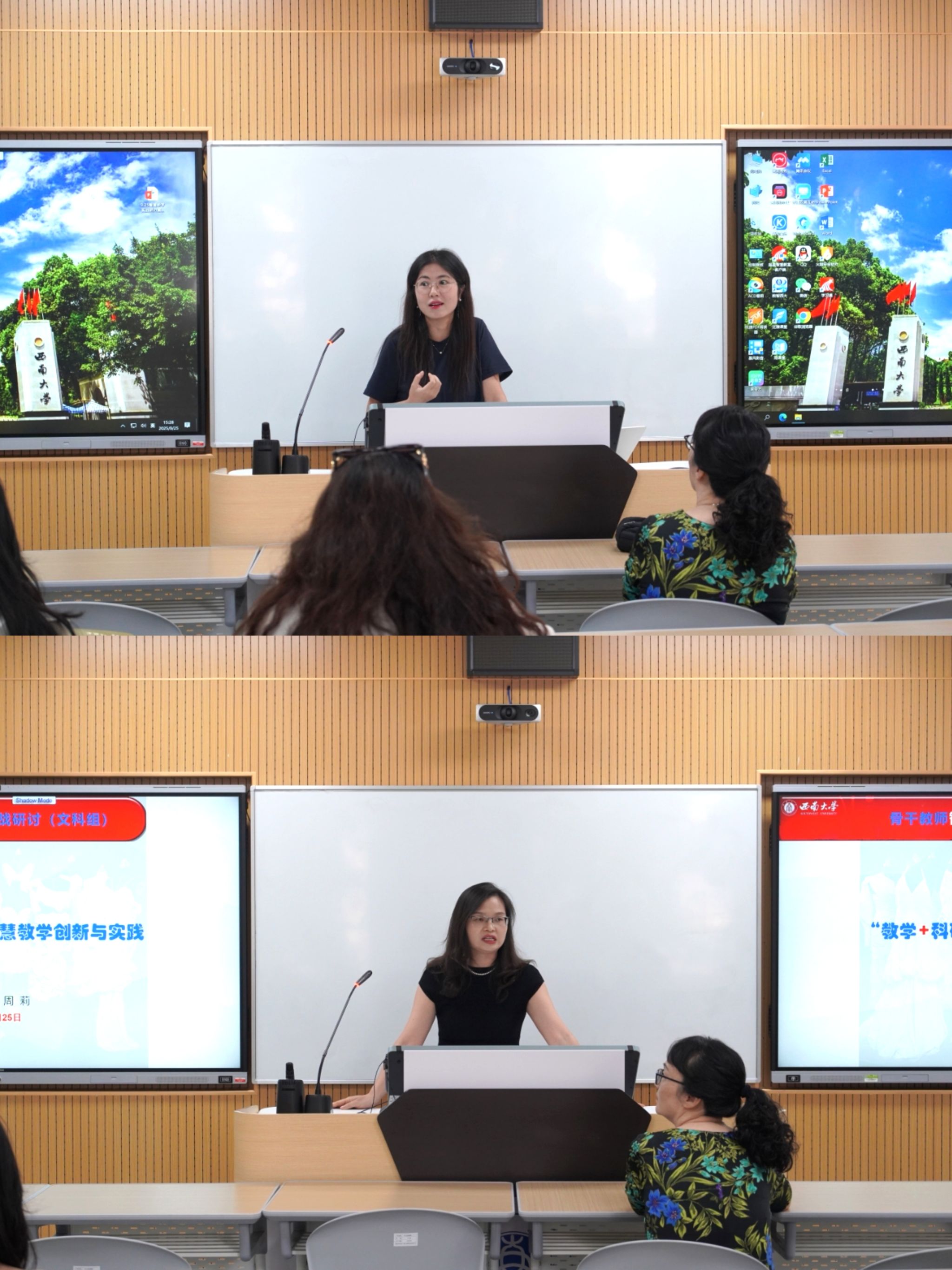 9月25日,bw必威西汉姆联官网在智慧教学楼举办2025年青年教师教学能力提升培训第二期暨骨干教师沙龙第一期。培训邀请超星泛雅集团数字化教育培训师杨芬、学校智慧教室项目负责人周海洋主讲;骨干教师沙龙分文科组、理科组同步开展,分别由蚕桑纺织与生物质科学学院周莉教授、法学院李丹副教授,以及农学与生物科技学院梅家琴教授、计算机与信息科学学院 软件学院胡莎老师、药学院 中医药学院郭婷老师担任分享嘉宾,近百名教师现场参与。