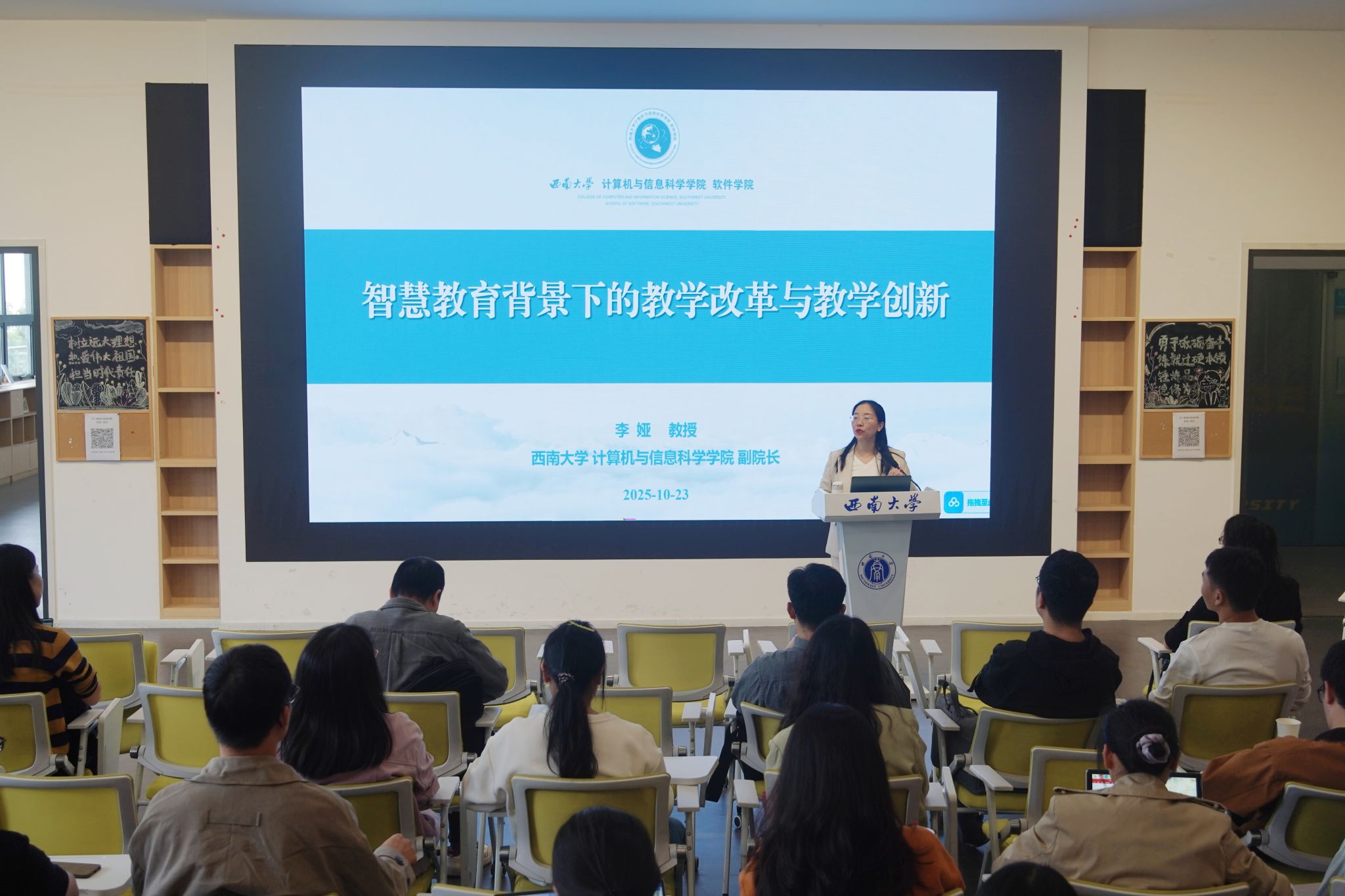 李娅以“智慧教育背景下的教学改革与创新”为主题,从教师成长路径规划、高效学习模式构建、跨学科团队协同、AI赋能课程建设与实施四个维度,为青年教师带来系统而全面的分享。她鼓励青年教师将教改项目申报与教学比赛作为能力提升的重要抓手,主动适应智慧教育发展趋势,通过“以输出促输入”的方式倒逼自身专业成长,推动教学创新理念落地为实际教学成果。为破解青年教师在运用 AI 技术解决实际教学难题时面临的困境,李娅重点拆解了“AI+交叉领域知识拓展”“AI+分层教学精准施策”“AI+时事案例动态融入”“AI+编程思维能力培养”四条可操作路径,鼓励青年教师打破顾虑,勇敢迈出教学创新实践的第一步。