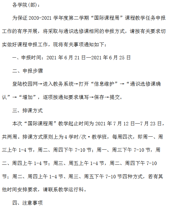 关于申报2020-2021学年第二学期“国际课程周”本科教学任务的通知