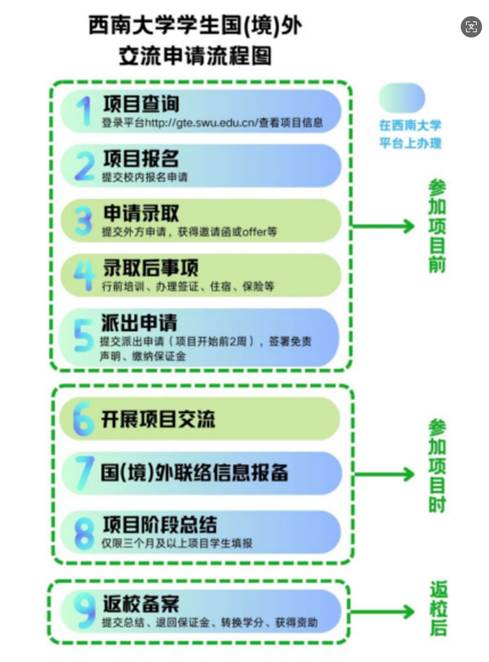 1. 根据如下图示完成项目申请、派出、返校等流程。(提交报名表后,请关注申请流转记录(平台-个人中心):