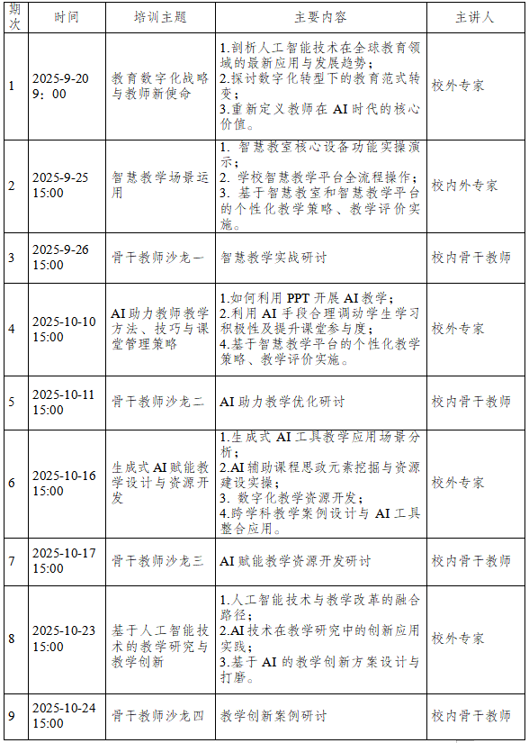 2025年9月—2025年10月,采用“集中授课+沙龙研讨+实践应用”的混合式培训模式。