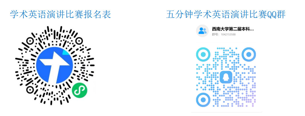 即日起开始报名,请有意参赛的选手尽快加入比赛QQ群(群号:1042153588),并在线填写学术英语演讲比赛报名表(微信扫描下方二维码或进入下方链接进行报名),2026年1月18日报名截止。 2026年3月中旬,选手将初赛作品及相关材料打包发送至QQ邮箱:2047302568@qq.com,提交材料包括:论文原稿、PPT文档(提交pptx格式的文件)和初赛视频。