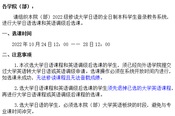 关于部分2022级全日制本科学生选大学日语课程和英语调级后选课的通知