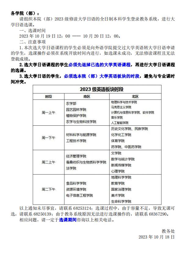 关于部分2023级全日制本科学生大学日语课程选课的通知
