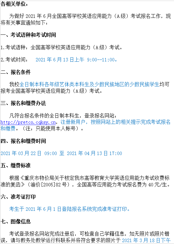 关于2021年6月全国高等学校英语应用能力(A级)考试报名工作的通知