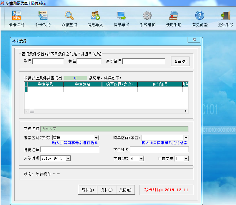 3.学院通过“学生购票优惠卡防伪系统”软件里的“补卡发行”功能,修改学生火车票学生优惠卡中“购票区间(家庭)”信息;