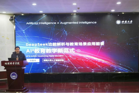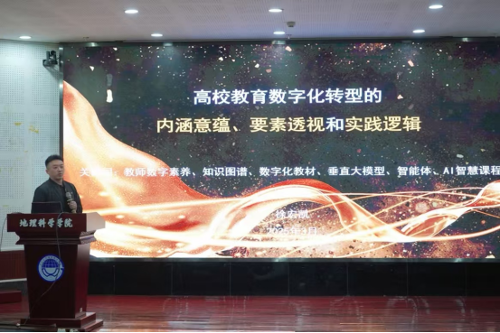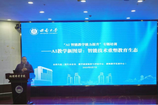 3月7日,学校在地理科学学院101会议室举办“AI智能教学能力提升”专题培训会。本次培训以“AI教学新图景:智能技术重塑教育生态”为主题,邀请本科生院副院长徐宏凯、人工智能学院副教授张里博作专题报告。培训活动由教师教学发展中心主任田晓伟主持。1000余名教师通过线下学习与线上直播相结合的方式同步参与培训。