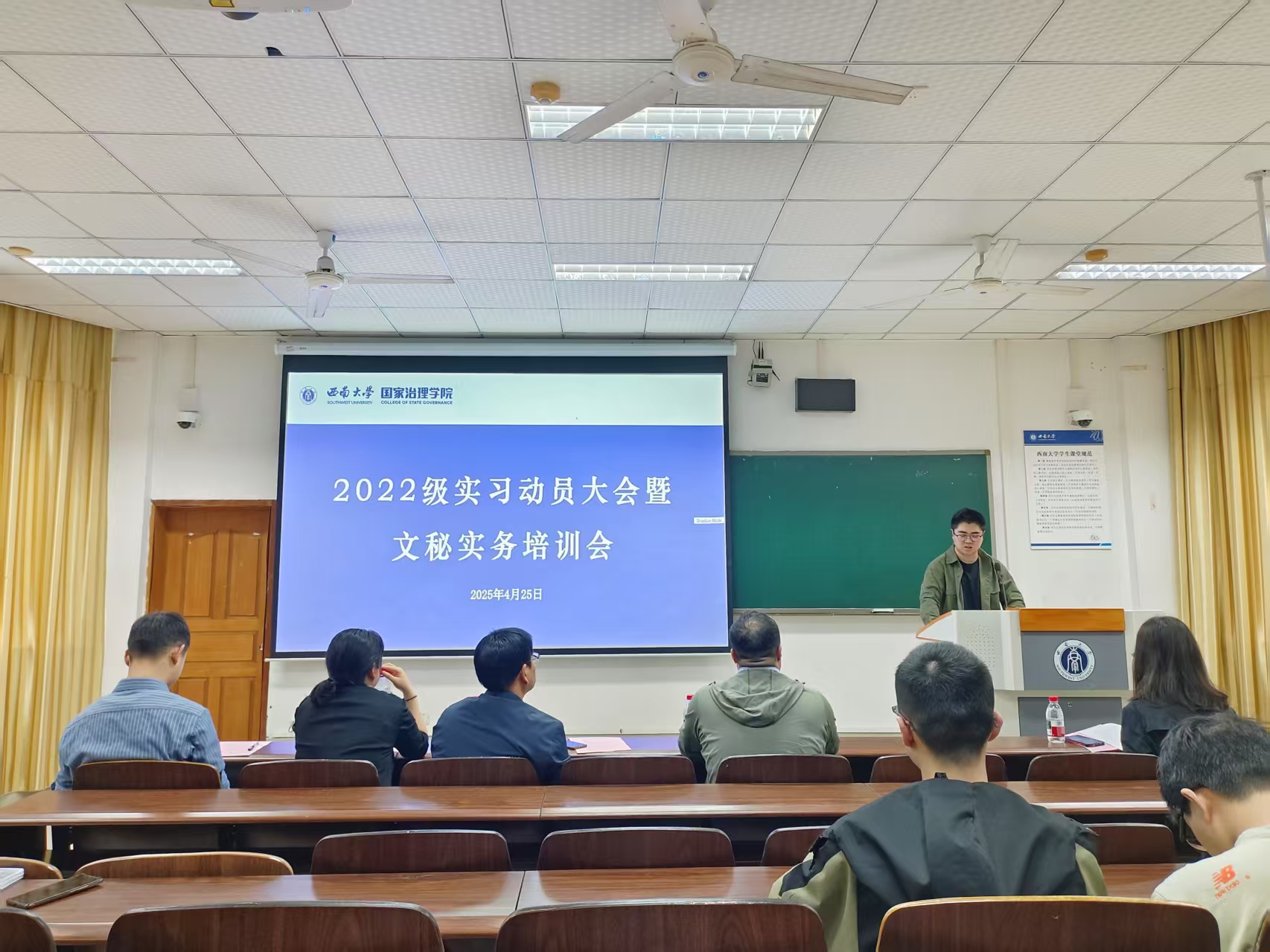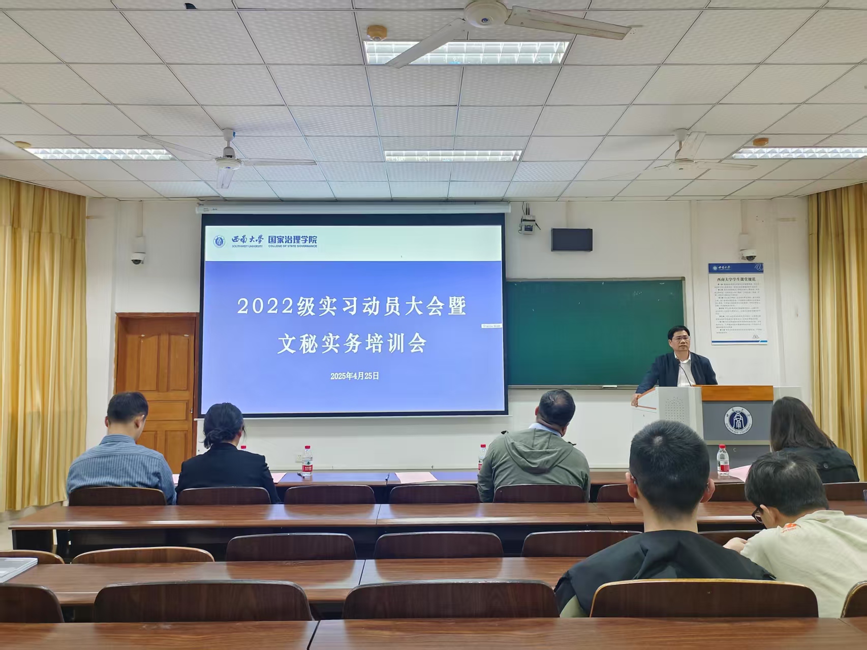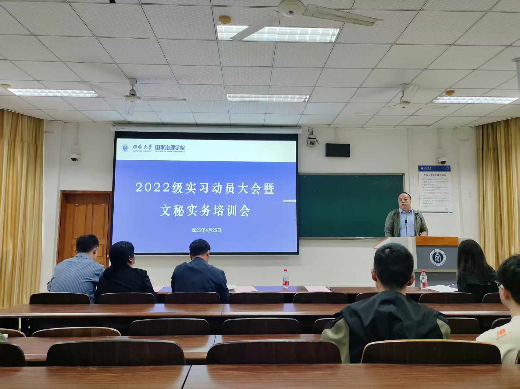实习动员大会结束之后,紧接着进行了文秘工作实务培训会。主讲人王加维书记结合多年机关工作经验,提炼文秘工作“三大法则”:精确办文须严守“政治关、政策关、文字关”;周全办会需把握“方案预演、流程推演、应急演练”三大环节;智慧办事要践行“首问负责、限时办结、闭环管理”工作机制。同时,他强调文秘人员需“全能型发展”——能写、会说、善协调,希望同学们在实际工作中学会主动沟通、亲自沟通、第一时间沟通。