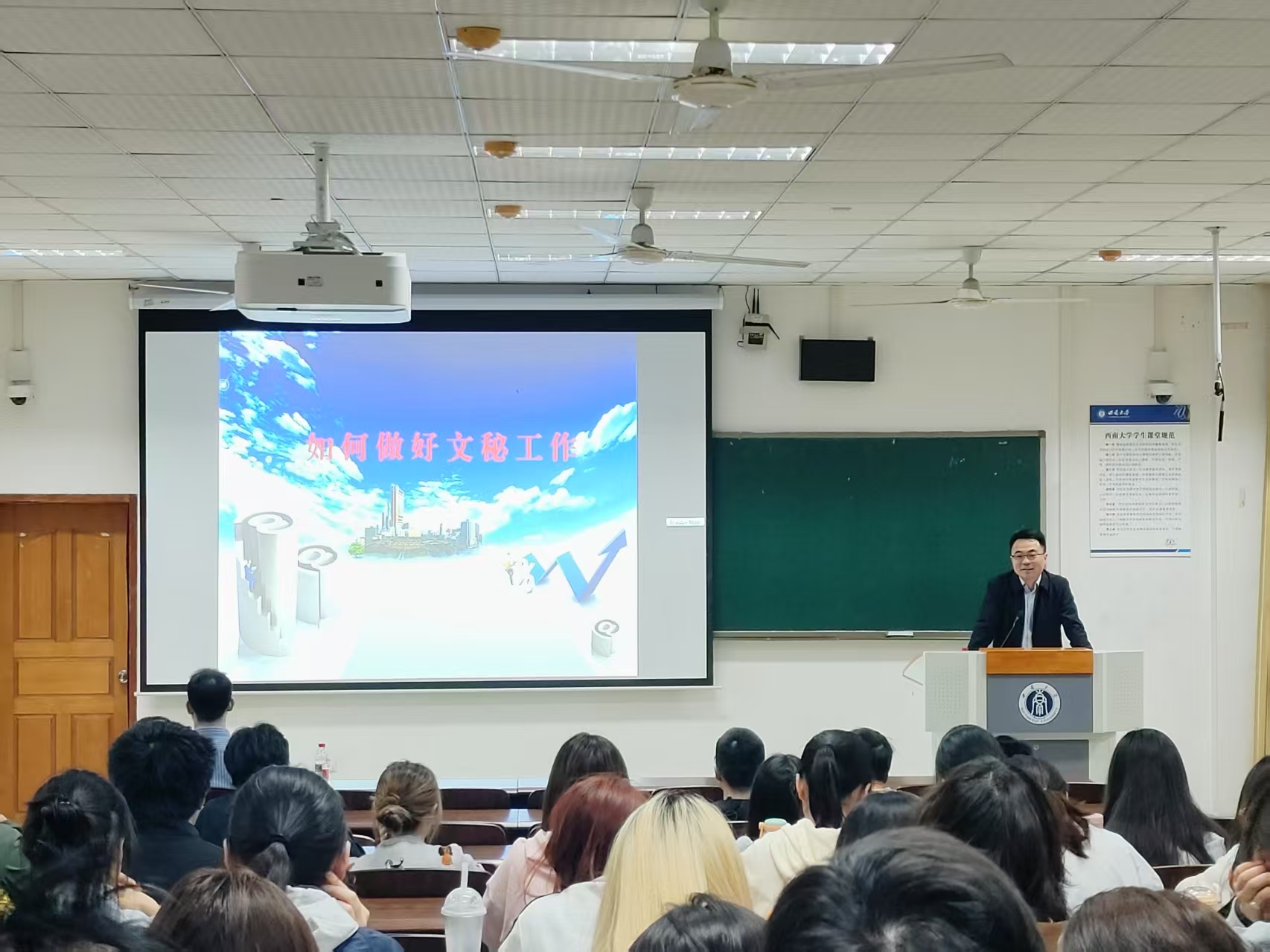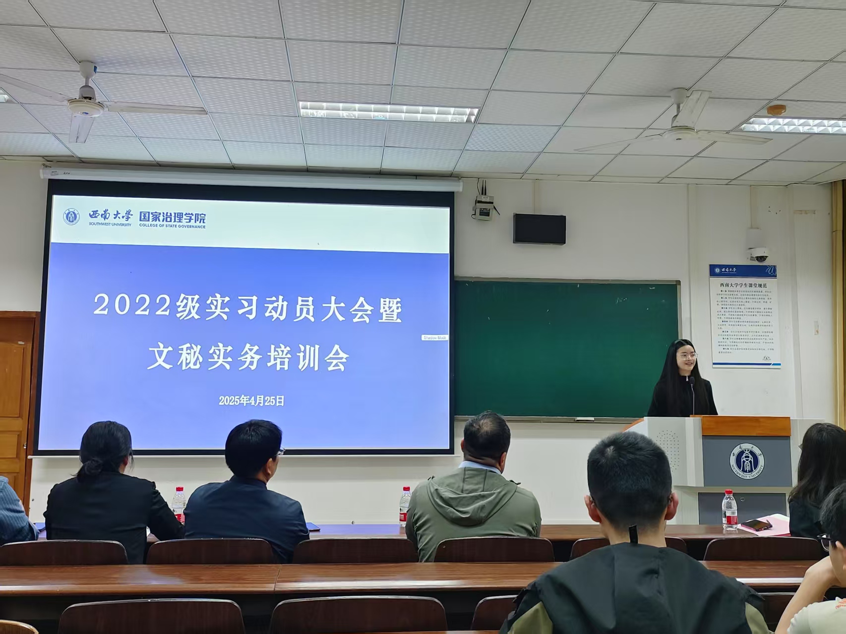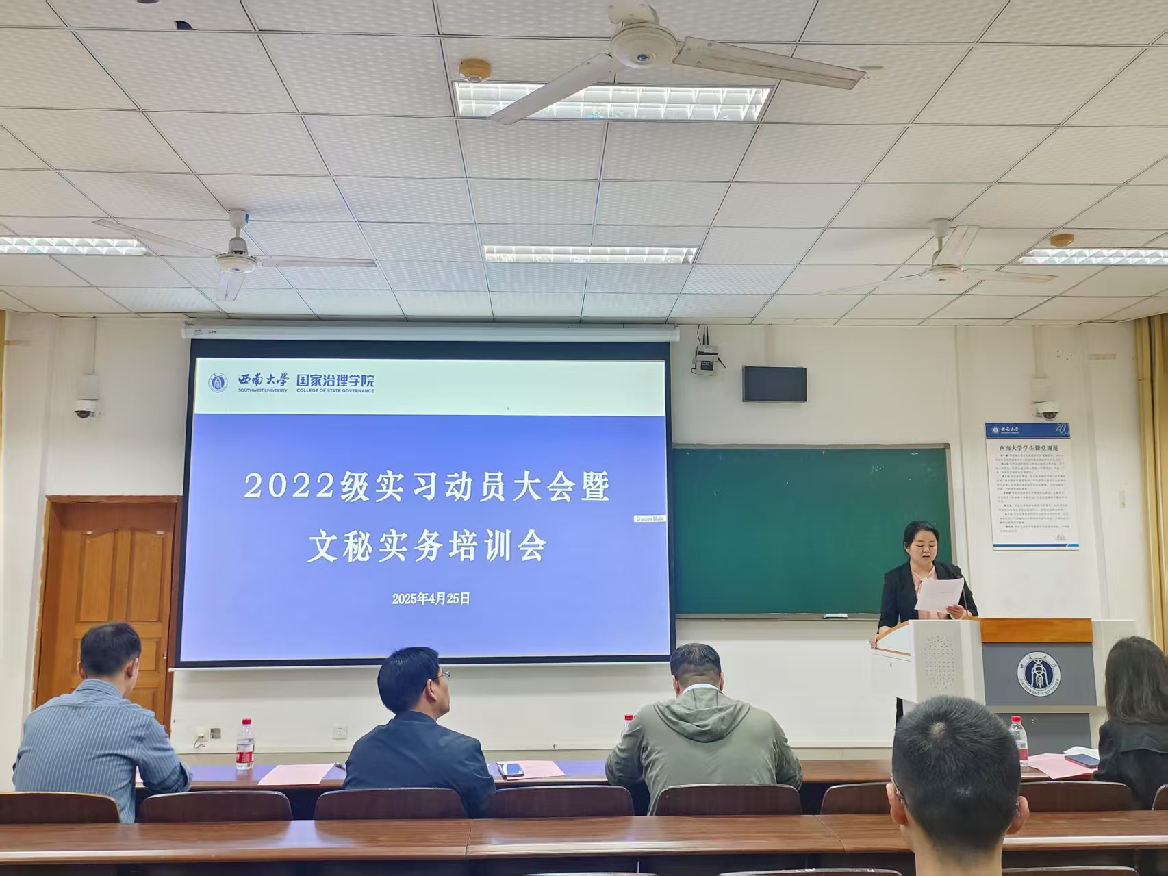 实习动员大会结束之后,紧接着进行了文秘工作实务培训会。主讲人王加维书记结合多年机关工作经验,提炼文秘工作“三大法则”:精确办文须严守“政治关、政策关、文字关”;周全办会需把握“方案预演、流程推演、应急演练”三大环节;智慧办事要践行“首问负责、限时办结、闭环管理”工作机制。同时,他强调文秘人员需“全能型发展”——能写、会说、善协调,希望同学们在实际工作中学会主动沟通、亲自沟通、第一时间沟通。