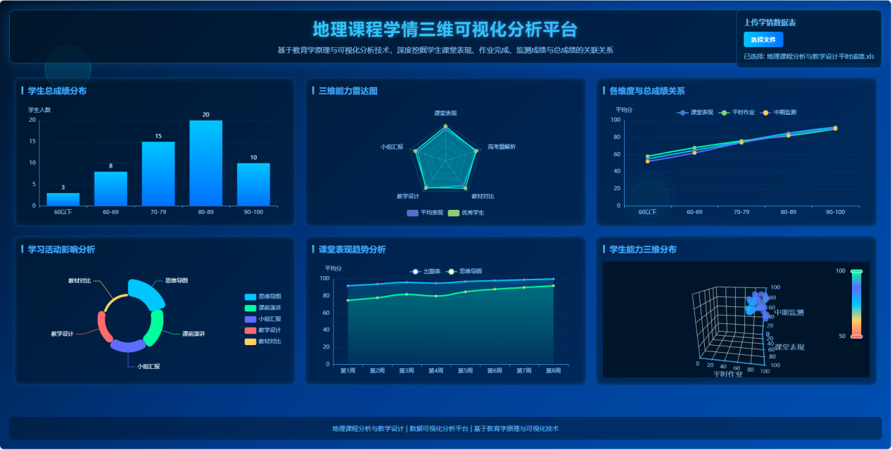 依托培训与赛事积累的经验,我带领团队研发“学情三维分析平台”——基于教育学原理与可视化技术,深度挖掘学生课堂表现、作业完成质量、监测成绩等数据关联,通过“总成绩分布”“能力雷达图”“表现趋势分析”等可视化呈现,帮助教师精准把握学生学习状态与需求。