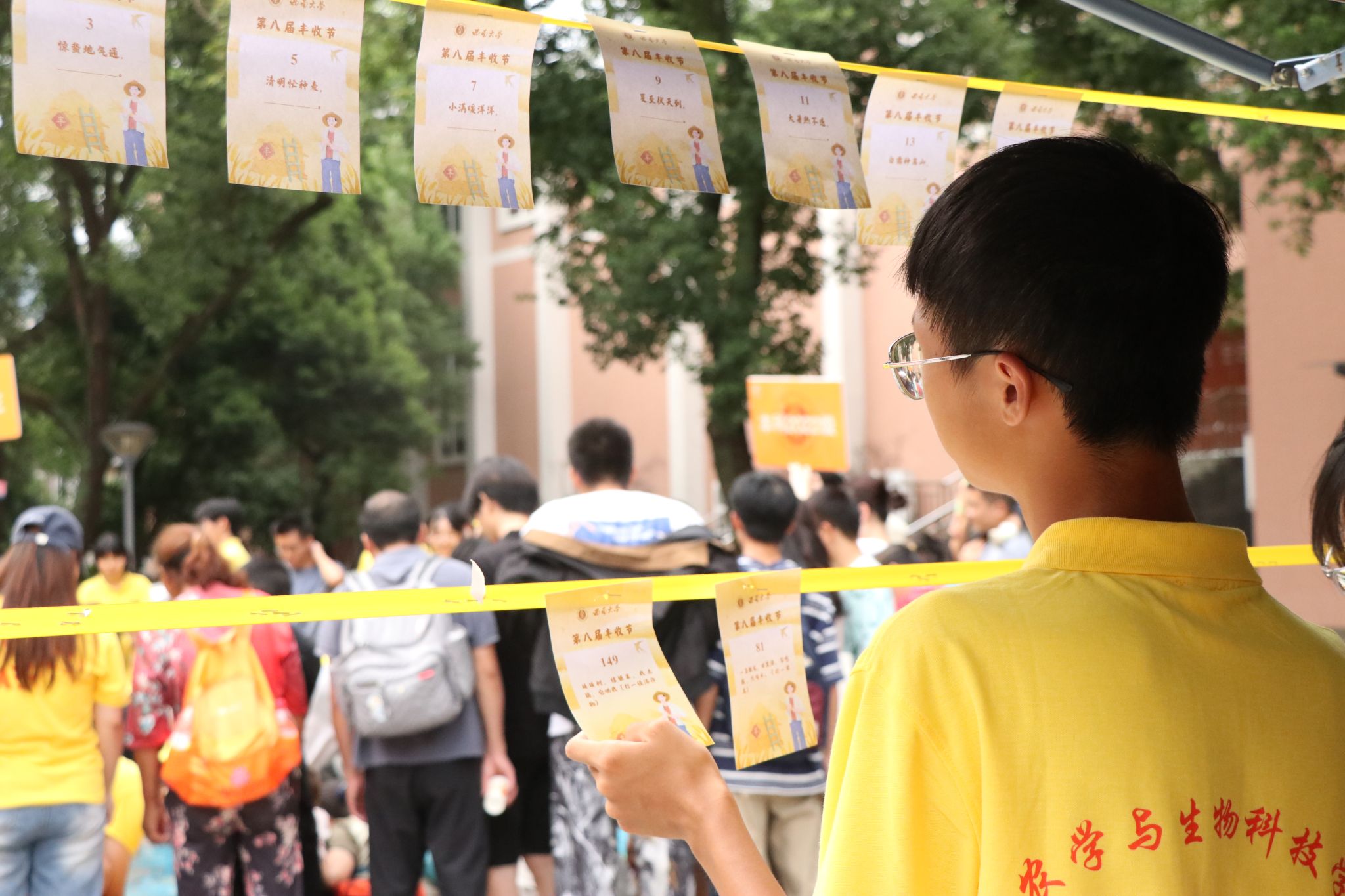 活动还设置了农事竞赛活动,涵盖团体赛和个人赛。在比赛现场,“颗粒归仓”“浑水摸鱼”“硕果累累”“辨识五谷”等充满农村农事特色的竞赛项目接连展开,随着计时器滴答作响,“浑水摸鱼”比赛拉开帷幕,队员们迅速弯腰伸手,滑溜溜的泥鳅和偶尔脱手的鲤鱼跃向空中,引得一片惊呼声。个人赛场地被参赛选手和观众围得里三层外三层,“辨识五谷”“不失圭撮”“花灯盏盏”等项目紧张而激烈地进行着。选手们各展其能,奇思妙想频出,彰显出西大学子的无限智慧与创造力。整个运动场欢笑声、加油声、喝彩声此起彼伏,气氛十分热烈。这些竞赛项目全部源于农村日常农事,展示农业生产的不易以及农民朋友日常活动的趣味性。参与的师生们通过亲自体验,既体会到劳作的艰辛,又分享了收获的喜悦,从而真正懂得珍惜粮食、热爱劳动,也让传统农耕文化在欢声笑语中活起来,增强了农科专业学子的认同感,坚定了他们对农科专业的自信。