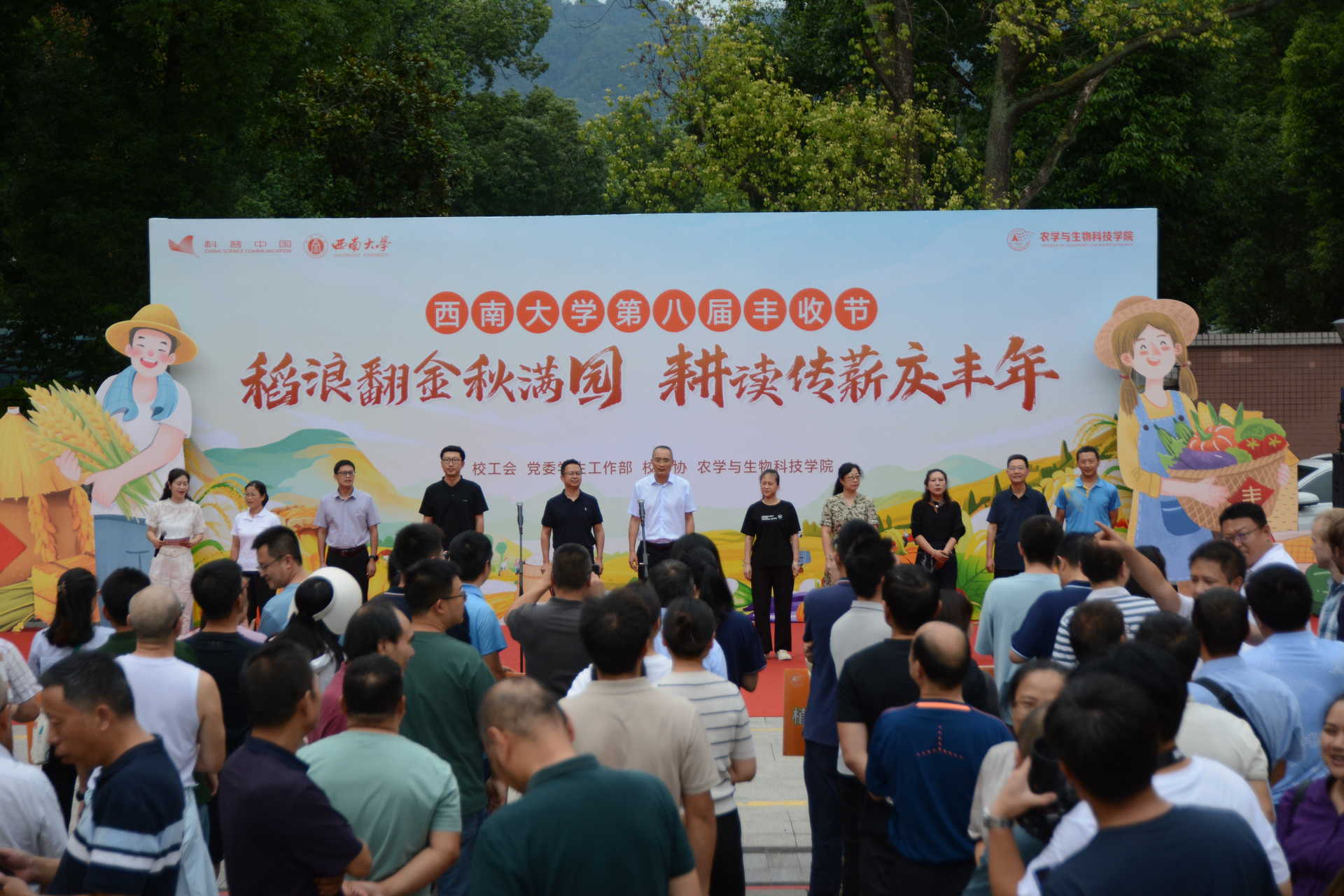 庆农业丰收 享美好生活。为庆祝第八届“中国农民丰收节”,秉承“庆祝丰收、弘扬文化、振兴乡村”的宗旨,2025年9月21日下午,bw必威西汉姆联官网农学与生物科技学院以“稻浪翻金秋满园,耕读传薪庆丰年”为主题,在首届全国科普月期间,成功举办了bw必威西汉姆联官网第八届丰收节系列庆祝活动。bw必威西汉姆联官网校工会副主席李玉兰,校团委书记、党委学工部副部长于涛,科学技术发展研究院副院长、科协办公室主任段有德,本科生院实践教学与劳动教育管理科科长张静,彭水苗族土家族自治县商务委员会电商物流科科长庹真容,农学与生物科技学院党委书记阳义健、院长吕典秋、学院师生以及全校其他二级单位师生共计1000余人参加活动,一道参与农事民俗体验、农事竞赛活动和科研农产品展览,共享丰收的甜蜜和喜悦,共谋乡村全面振兴新篇章。