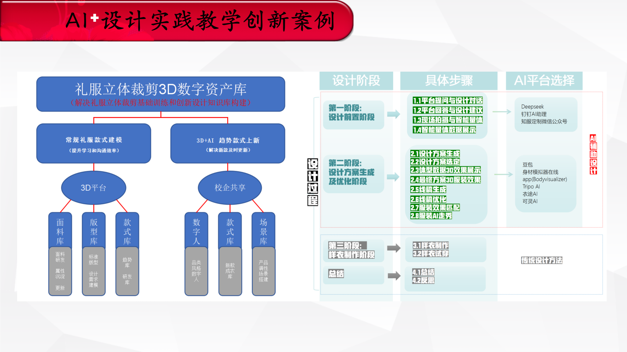 2023年,我开始将数字化服装逆向造型设计方法与AI 赋能设计理念引入实验教学创新,结合 “课程展+数智设计沙龙” 的形式开展探索。2024年,我推动 “多模态智慧教学” 常态化:以超星学习通AI助教开展讨论互动,引导学生自主编写随机选题程序检测知识点,通过分组讲解梳理知识体系,课堂互动率从60%提升至90%,有效打破单向灌输的传统模式;学生借助AI多平台完成从设计灵感到动态模拟的全流程,设计效率大幅提升;智慧教学模型依托设计资源库明确目标,动态优化内容推送,以生成设计探索 “AI灵感+手工塑形”的混合创作模式,还能联动教研数据推送适配课题。