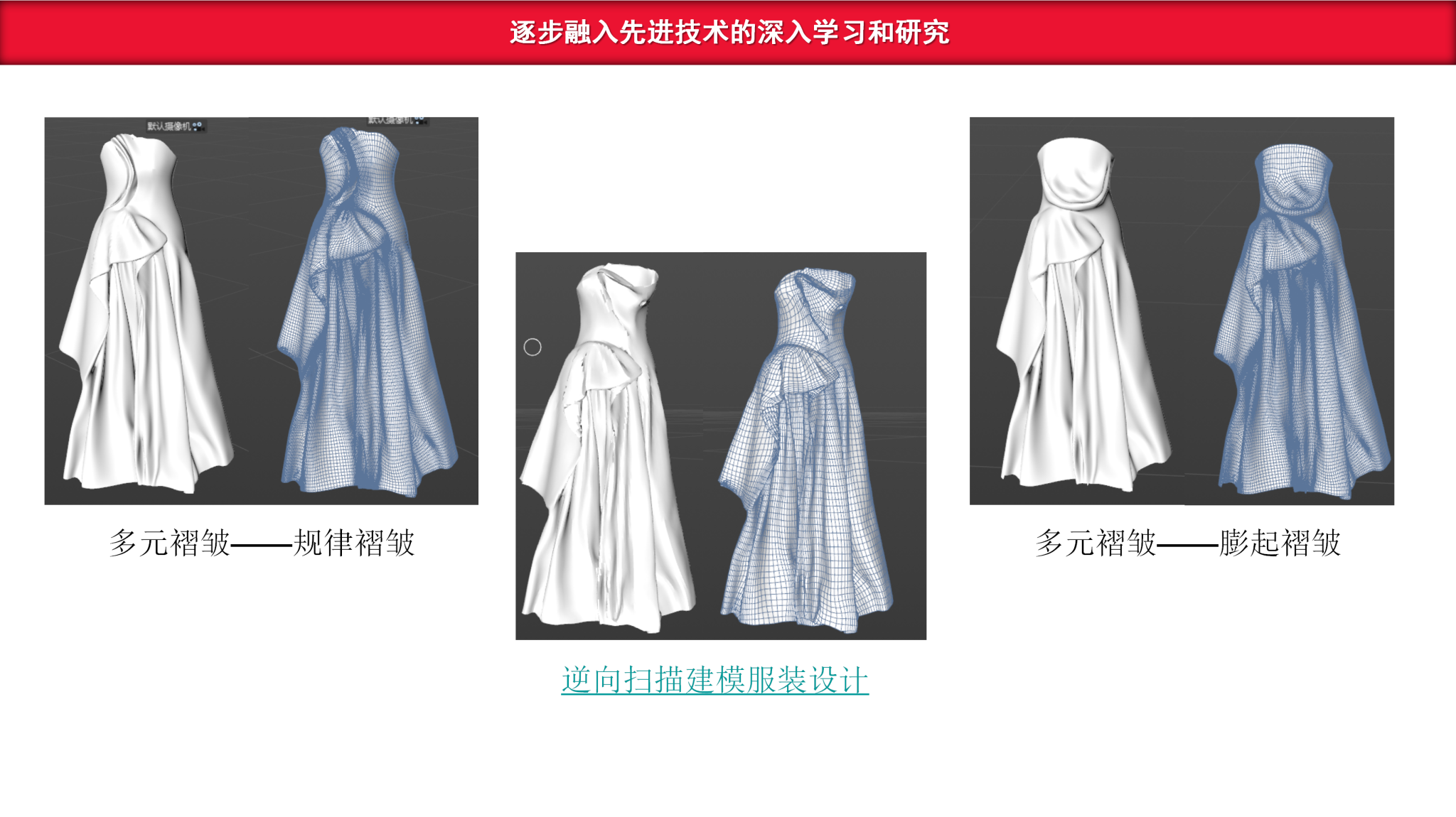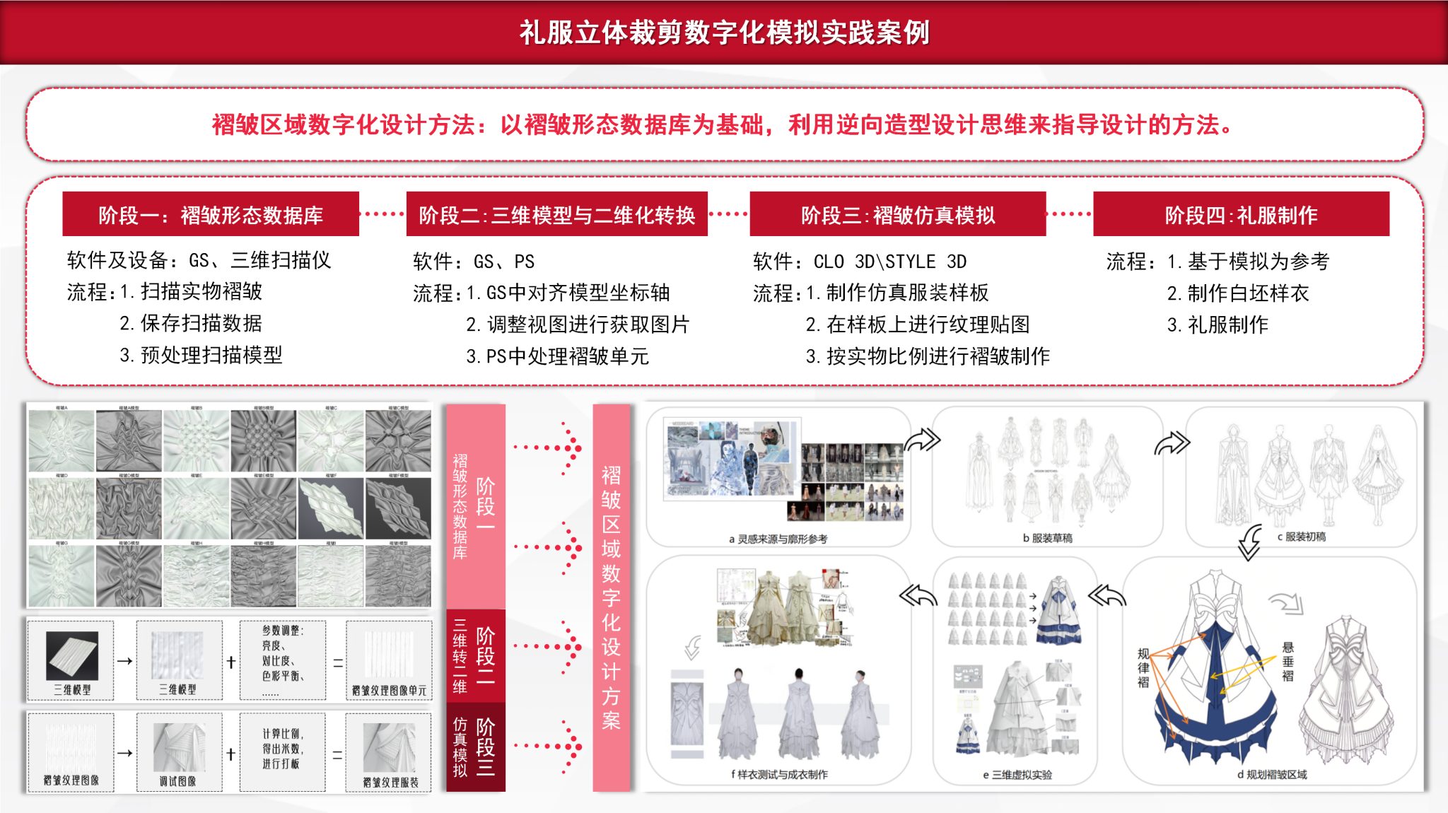依托成衣立体裁剪核心课程的建设经验,我进一步搭建起成衣立体裁剪、礼服立体裁剪、创意立体裁剪三位一体的完整立体裁剪课程体系。在礼服立体裁剪课程教学中,我探索将传统礼服设计与数字化技术深度融合,实现虚拟作品开发,形成以 “褶皱区域数字化设计” 为核心的特色研究方法;通过攻克 “服装形态快速虚拟还原” 难题,为设计者开展二次造型拓展提供全新思路与技巧,最终凝练出 “三维逆向造型设计方法论”。期间,我先后出版规划教材《立体裁剪》(2010 年)、译著《国际服装立裁设计:美国经典立体裁剪技法》(2019年,系国内体量最大的立体裁剪领域译著)。